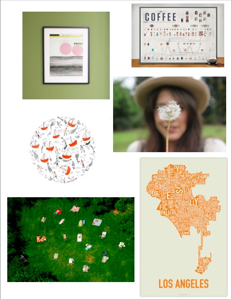 pink circle wall art from west elm (on sale in the store!)|coffee chart print from pop chart lab|sea dog print from Sarah Burwash on etsy (first seen at b for bonnie)|original dandelion wish photograph|summer city photography from Ciao, Chessa! on etsy|los angeles poster from ork posters!