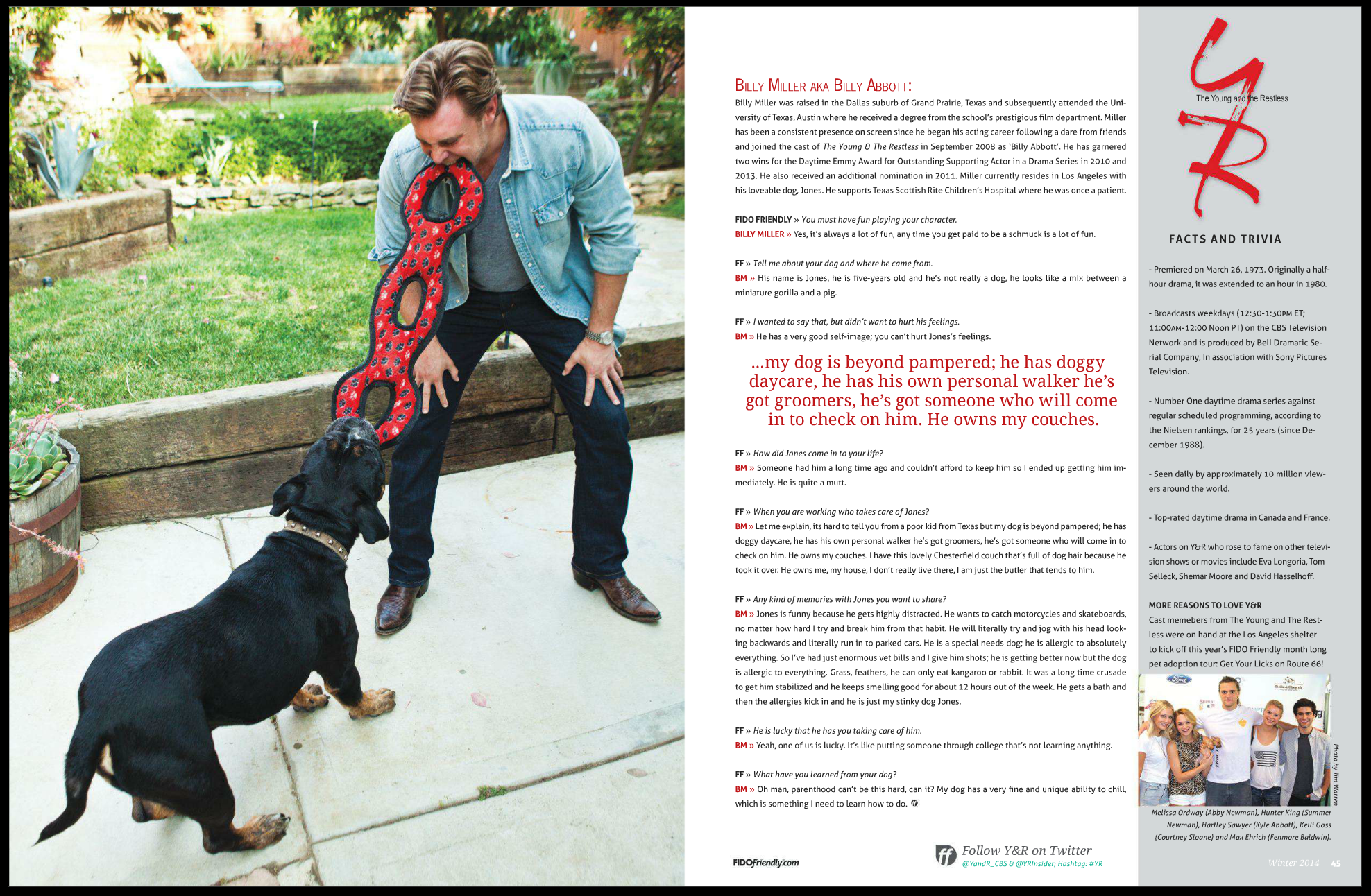 Screen Shot 2014-01-25 at 7.03.44 PMI’m thrilled to finally share these photos I shot many months ago for the current issue of Fido magazine! Shooting these dudes from The Young & the Restless and their dogs was such a delightful challenge. Photographing dogs can be so unpredictable in both good and bad ways. Yes, they don’t always sit still like a human will, but they provide beautiful movement and personality to a photo, and tend to spark something in their owners I might not have captured otherwise. Screen Shot 2014-01-25 at 7.13.28 PMScreen Shot 2014-01-25 at 7.13.47 PMScreen Shot 2014-01-25 at 7.14.04 PM